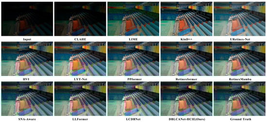 We trained the DBLCANet-HCIE model on the LOLV1 dataset and compared it with 12 other low-light image enhancement methods: CLAHE [], LIME [], KinD++ [], URetinex-Net [], HVI [], LYT-NET [], PPformer [], Retinexformer [], RetinexMamba [], SALLIE [], LCDBNet [], and LLFormer []. Table 1 presents the quantitative performance of these diverse enhancement methods on the LOLv1 dataset. It is evident that our proposed method demonstrated superior performance compared to the majority of these methods in both the PSNR and SSIM indicators. Notably, our method achieved the best results in the SSIM category and the second-highest score in the PSNR metric, with a marginal difference of only 0.12 dB from the leading method, HVI.