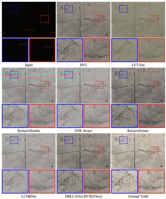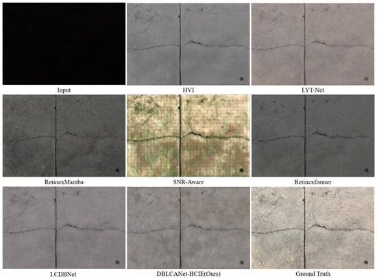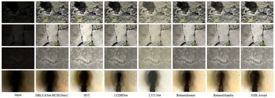 Many hydraulic structures are located in mountainous regions, where the environment is complex and includes numerous structural elements that require detailed inspection []. The quality of hydraulic concrete images is significantly influenced by factors such as the lighting conditions, precipitation, haze, and other environmental elements, with these effects being particularly pronounced in such challenging natural settings. The inherent complexity of hydraulic concrete images is manifested in drastic variations in luminance, contrast, and color, which pose significant challenges for subsequent visual tasks such as defect detection, as shown in Figure 1. Therefore, it is crucial to explore efficient image enhancement techniques to meet the stringent demands for image quality and clarity in practical applications []. In recent years, numerous methods have emerged in the field of image enhancement, including techniques based on histogram equalization [], methods grounded in Retinex theory [], strategies within deep learning frameworks [], and, more recently, transformer-based techniques []. However, most of these methods focus on enhancing images in general scenes, with relatively little research on specialized enhancement methods for hydraulic concrete images. As a result, when these methods are applied to hydraulic concrete images, further adaptation and optimization are often necessary to fully realize their potential.