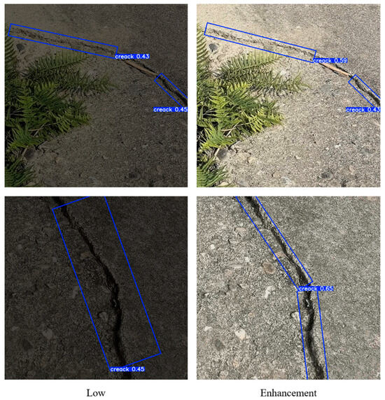 Building upon our previous work on rotational crack detection in hydraulic concrete, where we constructed a dataset of 5432 crack images with oriented bounding box annotations, we fine-tuned a YOLO11n-obb model to serve as a baseline detector. To evaluate the impact of our enhancement method on downstream detection tasks, we selected 452 low-light crack images from our hydraulic concrete inspection dataset and manually annotated them using the same rotation-based protocol. These images were tested using the pre-trained YOLO11n-obb model under two conditions: without enhancement and after applying various enhancement methods. As reported in Table 7, our method yielded the highest performance, improving precision by 11.38% and mAP@50 by 13.80% compared to the unenhanced input, surpassing all competing approaches. The visual comparisons in Figure 14 further illustrate this advantage: unprocessed low-light images often suffer from missed detections, whereas our enhanced images show notably improved crack localization with minimal omission. These results highlight the practical effectiveness of our enhancement model in improving not only image quality but also the accuracy and reliability of downstream defect detection in real-world hydraulic concrete inspection scenarios.
