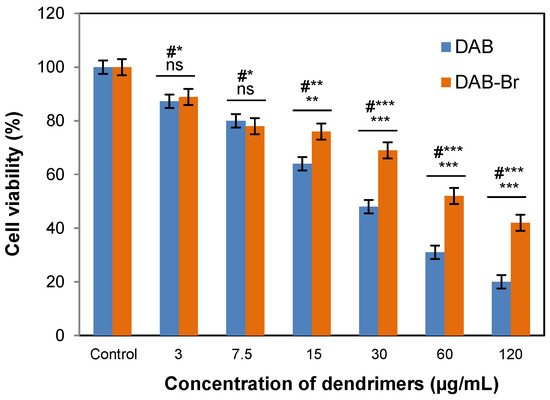A cytotoxicity assessment was carried out on the HFF-1 cell line using an MTT assay. The signs of cellular adaptation or cellular stress were checked at the 24th hour after treatment with both dendrimers. At concentrations of 3 μg/mL and 7.5 μg/mL, cell survival remained high (80–90%) with no significant differences between the effects of both dendrimers (Figure 2). After treatment with concentrations above 15 μg/mL with both dendrimers, the survival of HFF-1 significantly reduced in a dose-dependent manner, especially for DAB: the IC50 value was at 27 μg/mL, and for DAB-Br, the IC50 value was at 68 μg/mL.