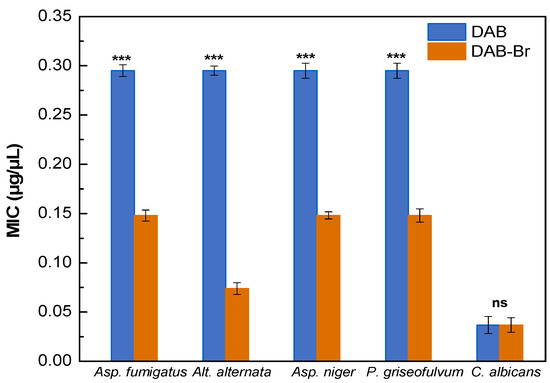 Figure 3. Dendrimers’ minimum inhibitory concentrations (MICs) on five fungal strains. Statistical significance between the effects of DAB and DAB-Br on each fungal strain is denoted with *** (p < 0.001). The designation “ns” (not significant) shows statistically insignificant differences.