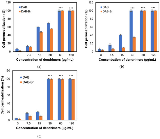 Figure 4. Comparative quantitative analysis of cell membrane permeabilization following treatment of HFF-1 cells with DAB and DAB-Br at the (a) 2nd hour, (b) 24th hour, and (c) 48th hour. Statistical significance is denoted by *** (p < 0.001) when comparing effects of both dendrimers.