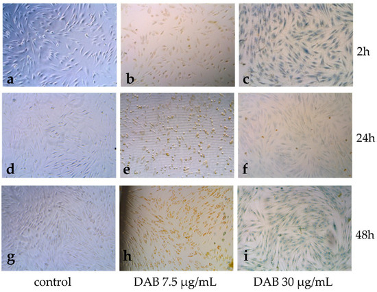Figure 5. Changes in cell morphology and cell permeabilization with trypan blue staining at the 2nd, 24th, and 48th hour post treatment with DAB at concentrations of 7.5 µg/mL and 30 µg/mL. For photo shooting, random fields were selected. Controls (untreated cells, a,d,g); cells treated with DAB at a concentration of 7.5 µg/mL (b,e,h) and 30 µg/mL (c,f,i). Magnification 200×.