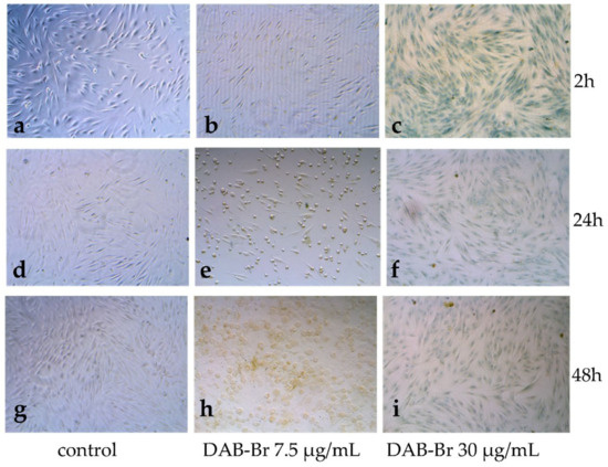 The trypan blue exclusion (TBE) test was used for the evaluation of cell membrane integrity as described [28]. Cells were cultured in a well plate at a concentration of 1 × 105 cells/well. Subsequently, the cells were treated with both dendrimers at concentrations of 3 µg/mL, 7.5 µg/mL, 15 µg/mL, 30 µg/mL, 60 µg/mL, and 120 µg/mL. The plate was then incubated in a thermostat at 37 °C for 2, 24, and 48 h. Untreated cells served as control variants. After incubation, the medium with the dendrimers was pipetted, and the cells were washed with PBS. Microscopic observation and photography were performed using a phase-contrast microscope (Nikon Eclipse TS 100, Tokyo, Japan). The images of the cells treated with DAB, DAB-Br, and the control variants were taken at the 2nd, 24th, and 48th h, with 10 images taken per well. Cell morphology and characteristics of the monolayer were assessed by direct observation of the wells by phase-contrast microscopy (Leica DM5500 B., Leica Microsystems GmbH, Wetzlar, Germany).