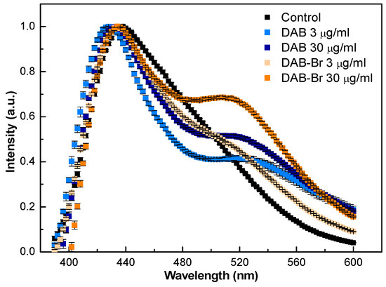 Figure 7. Laurdan fluorescence emission spectra of HFF-1 cells upon treatment with DAB and DAB-Br at concentrations of 3 and 30 µg/mL at physiological temperature (37 °C).