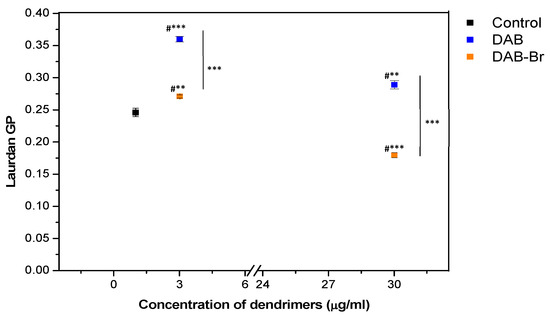 Figure 8. Laurdan general polarization (GP) of HFF-1 cells as a function of DAB and DAB-Br at concentrations of 3 and 30 µg/mL, measured at physiological temperature (37 °C). A statistical significance between the effects of DAB and DAB-Br at concentrations of 3 µg/mL to 30 µg/mL is denoted with *** (p < 0.001), and between the control (untreated cells), DAB, and DAB-Br, at each tested concentration, it is indicated with #** (p < 0.01) and #*** (p < 0.001).