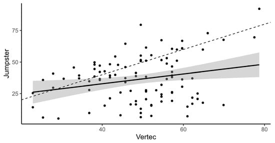 Only device-matched trials were used for the analysis, where trials with missing data for either measurement tool were discarded entirely. Data for both measurement tools were independently assessed for normality using the Shapiro–Wilk test. Next, descriptive statistics were calculated for the participant age, height, weight, maximum Vertec jump height, and maximum Jumpster jump height. Independent samples Welch’s t-tests were also conducted for these variables to assess possible differences between men and women.