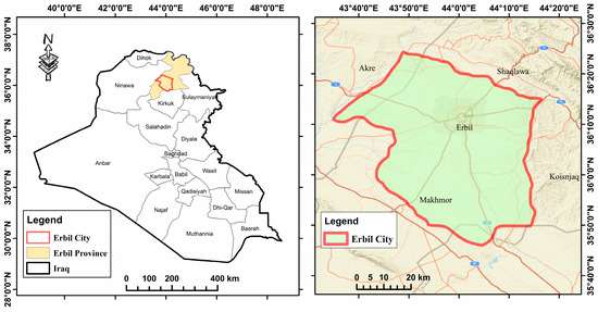 Erbil, located in northern Iraq, serves as the focus of this study. Its geographic coordinates are 36°11′28″ N and 44°0′33″ E, as illustrated in Figure 1. The region features a broad plain, interspersed with hills to the east that reach elevations up to 426 m above sea level [58]. The landscape is predominantly covered by Quaternary sediments that have accumulated due to the weathering and erosion of the neighboring highlands. Significantly, in the northern and northeastern parts of the study area, the Quaternary sediments lie atop the Bai Hassan formation, composed of molasses-type rock formations. The central section of Erbil is generally flat, whereas the northeastern and eastern areas present a more rugged landscape [59].