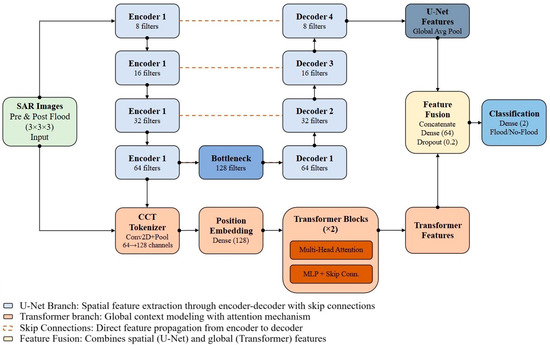This research introduced the Compact Convolutional Tokenizer-based Hybrid U-Net and Vision Transformer Model (CCT-U-ViT) (Figure 3). This innovative model features a hybrid architecture designed for Synthetic Aperture Radar (SAR)-based flood detection, integrating U-Net’s spatial feature extraction with the Transformer’s global context modeling. The system processes pre- and post-flood SAR images utilizing a U-Net encoder–decoder framework with skip connections; the encoder methodically extracts hierarchical features using 8, 16, 32, and 64 filters across four levels. Each encoder level corresponds to a decoder layer, facilitating the reconstruction of spatial details. At the bottleneck layer, equipped with 128 filters, the model employs three vital enhancement modules: a Compact Convolutional Transformer (CCT) tokenizer that transforms 2D pooled features into 1D tokens for sequential processing, position embedding for adding spatial awareness (a dense 128-dimensional structure), and transformer blocks that implement multihead attention mechanisms along with MLP and skip connections to capture long-range dependencies. The U-Net’s spatial features are merged with the global features derived from the transformer via a feature fusion module, which concatenates, densifies (to 64 channels), and applies a dropout rate of 0.2 for regularization. Ultimately, a binary classification head with dense layers differentiates between flood and non-flood pixels, enabling the model to utilize local spatial patterns through the U-Net path and global contextual relationships via the transformer path to delineate flood boundaries precisely.