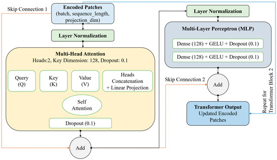 The transformer branch includes several encoder layers, each incorporating layer normalization, multihead self-attention with adjustable head counts and projection sizes, and position-wise feedforward MLPs that utilize GELU activations and dropout for regularization (Figure 7). Residual skip connections between the layers improve gradient flow and support stable training. Learned positional embeddings are combined with token embeddings to offer spatial context.