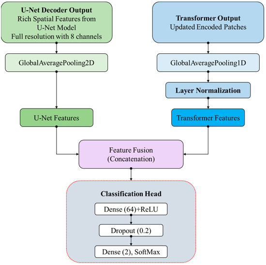 After processing independently, the global average pooled features from the U-Net decoder are concatenated with the transformer outputs to form a detailed feature vector that captures local spatial and global contextual information. The outputs of the U-Net model are 2D local feature maps. The use of GlobalAveragePooling2D computes the average of all the values in each feature map (channel) across both the height and width dimensions. Essentially, it reduces each 2D feature map (spatial grid) to a single scalar value, representing the average of all the values in that feature map. The output is a 2D tensor of shape (batch_size, channels), where each channel has a single average value computed from its corresponding 2D spatial grid. On the other hand, the Transformer outputs are 1D global feature sequences. The use of GlobalAveragePooling1D computes the average of all the values along the sequential dimension, resulting in a single value for each channel. The output is a 2D tensor of shape (batch_size, channels), where each channel contains the average of the values along the steps dimension. The fusion of the local features from U-Net and the global features from Transformer is then concatenated into single feature vectors, which are used for the classification layer.