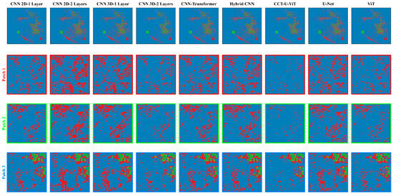 The CNN–Transformer hybrid approach (96.8% OA, 0.958 Kappa) demonstrates the effectiveness of combining convolutional inductive biases with transformer attention mechanisms, achieving superior performance compared to pure CNN or transformer architectures. However, the proposed CCT-U-ViT surpasses all baseline methods with an F1-score of 0.966 and mIoU of 0.933, indicating exceptional precision-recall balance and spatial overlap accuracy. The consistent performance gains across all metrics (2.1% improvement in Kappa, 1.1% in OA, 1.4% in F1-score, and 1.8% in mIoU compared to the second-best method) provide strong empirical evidence for the architectural innovations incorporated in the CCT-U-ViT design, particularly the effective integration of multiscale feature fusion with hierarchical attention mechanisms optimized for satellite imagery analysis.