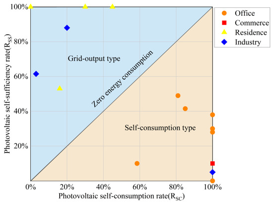 It is also important to consider the different methods of photovoltaic energy consumption across various buildings. A building is classified as a zero-energy consumption building when its annual photovoltaic power generation offsets its annual electricity consumption, as indicated by the diagonal line in Figure 3. If a building generates more electricity than it consumes, it is classified as a photovoltaic “grid-output” building (in the area above the diagonal line in Figure 3), while buildings that generate less are termed “self-consumption” buildings, found in the area below the diagonal line in Figure 3 [8]. The PV self-consumption rate in Figure 3 represents the proportion of photovoltaic electricity consumed locally compared to total generation, whereas the PV self-sufficiency rate measures how much of the building’s overall electricity consumption is covered by locally generated photovoltaic power [9,10,14].