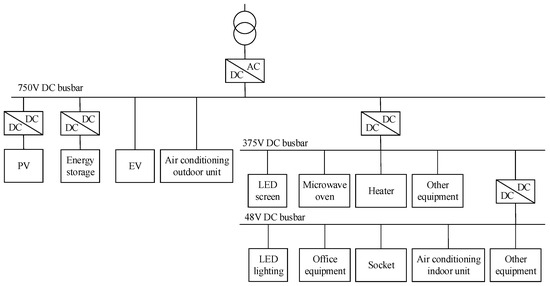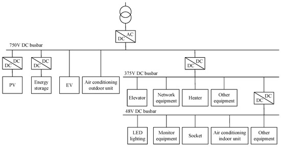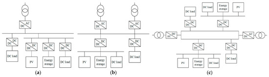 Table 1. Characteristics and applicable scenarios of typical topological network structures. - Determining Voltage Levels: The PEDF system typically adopts single or multiple voltage conversion levels [11,12,27]. The recommended voltage levels are DC750V, DC375V, and DC48V, in accordance with TCABEE030-2022, titled “The Design Standard for Direct Current Power Distribution of Civil Building”.