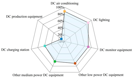 Figure 6. Distribution characteristics of the application type of DC electrical equipment in buildings [8]. - Identify flexible loads. Recognize and assess flexible loads, such as interruptible, transferable, and curtailable electrical equipment, focusing on their operating times and power needs.