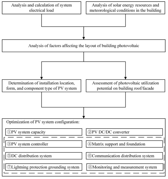 - Potential evaluation of building photovoltaic utilization. The first step is to assess the potential for building photovoltaic use in the building, analyzing the layout and transportation systems to determine the suitability of rooftop or facade installations [31,32,33].