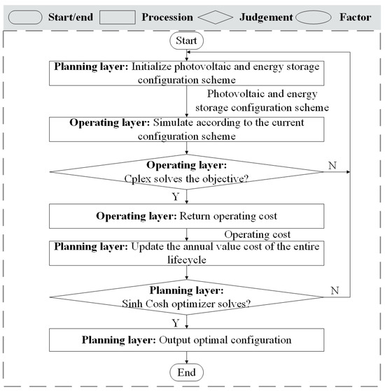 The solution process and information exchange for the planning and operating dual-layer model, based on Sinh Cosh optimizer and Cplex, are illustrated in Figure 9. The planning layer initializes configuration for photovoltaics and energy storage and sends them to the operating layer. The operating layer then optimizes the comprehensive goals of economic efficiency, low carbon emissions, and reliability using Cplex, providing feedback on operation and maintenance costs. The planning layer utilizes the Sinh Cosh optimizer to determine the optimal solution, thereby forming a closed loop that results in the best lifecycle cost for the system.