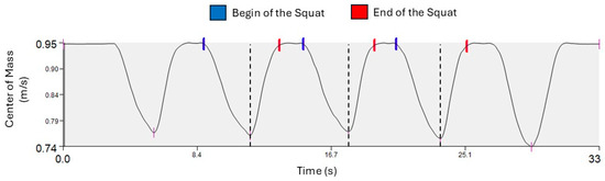 Each squat was segmented into descent and ascent phases. The start of the squat was defined when vertical center-of-mass velocity exceeded 0.02 m/s downward, and the end of the squat was defined when upward center-of-mass velocity decreased below 0.02 m/s (Figure 1). The lowest vertical center-of-mass position determined the transition point between the descent and ascent phases. External knee and hip moments were calculated using an inverse dynamics approach, and joint impulses for the descent and ascent phases were computed using the trapezoidal rule [20].