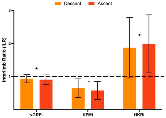 Interlimb ratios for vertical ground reaction force impulse, external knee flexion moment impulse and ratio of external hip flexion to knee flexion moment impulse during the descent and ascent phases of squats. Error bars represent ±1 standard deviation. * p-value of <0.05. Note: The dashed line represents an interlimb ratio of 1 and an equal distribution of loading for each variable between the injured and uninjured limb. Abbreviations: ILR, interlimb ratio; vGRFi, vertical ground reaction force impulse; KFMi, external knee flexion moment impulse; HKRi, ratio of external hip flexion to knee flexion moment impulse.