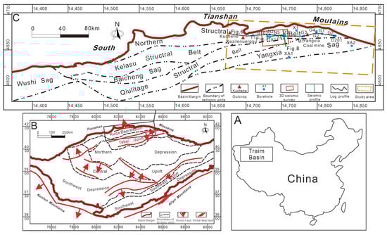 The Tarim Basin, the largest superimposed basin in China (Figure 1A), is primarily composed of a Paleozoic marine cratonic basin and Mesozoic–Cenozoic continental foreland basin [,]. It is divided into the following seven major tectonic units: the Kuqa Depression, Tabei Uplift, Northern Depression, Central Uplift, Southwest Depression, Southeast Uplift, and Southeast Depression (Figure 1B). The Kuqa Depression, trending NEE, is located in the northern part of the basin, bordered by the South Tianshan Mountains to the north and the Tabei Uplift to the south. This structurally complex region is rich in oil and gas resources, making it a focus of academic and industrial interest [,,,].