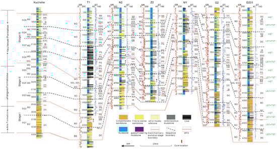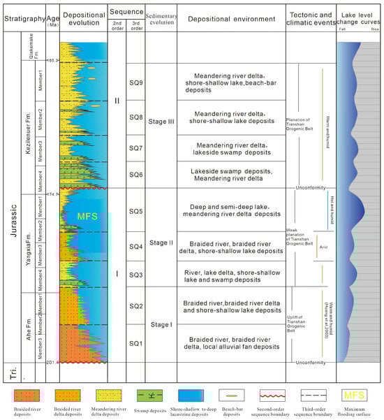 In the Kuqa Depression, two regional unconformities at the top and bottom of the Jurassic define a first-order sequence. Using integrated well-logging and seismic data from 3D seismic surveys and 2D seismic lines, the Jurassic is further classified based on angular unconformities, depositional transition surfaces, erosion-induced truncation surfaces, and transgressive–regressive cycles observed in well-logging data. This classification identifies two second-order sequences and twelve third-order sequences (SQ) (Figure 2). The second-order sequences correspond to long-term lake-level fluctuations, reflecting regional transgressive–regressive events that influenced the entire depression. This study focuses on nine third-order sequences (SQ1–SQ9) (Figure 2), encompassing two second-order sequence boundaries and eight third-order sequence boundaries.