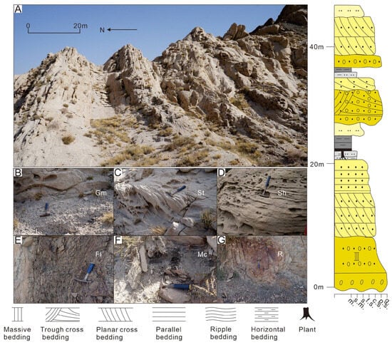 Braided river delta plain depositional characteristics of the Jurassic Ahe Formation at the outcrop Kezilenuergou (outcrop location in Figure 1). (A) Macroscopic characteristics of braided river delta plain deposits; (B) lag deposits within braided channels; (C) pebbly sandstone with trough cross-bedding; (D) pebbly sandstone with high-energy parallel bedding; (E) horizontally bedded siltstone within floodplain; (F) carbonaceous mudstone; (G) root clay.