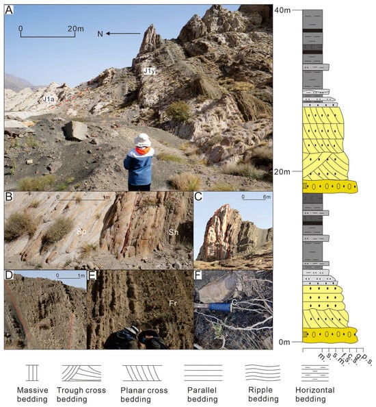 Meandering river delta plain depositional characteristics of the Jurassic Yiangxia Formation in the outcrop Kezilenuergou (Outcrop location in Figure 1). (A) Macroscopic characteristics of meandering river delta plain deposits; (B) medium-fine sandstone with planar cross-bedding (left side of the red line) and parallel bedding (right side of the red line); (C) lateral migration of point bar; (D) continuous thin interbeds within wedge-shaped natural levee; (E) interbedded siltstone with ripple bedding and mudstone; (F) coal seams.