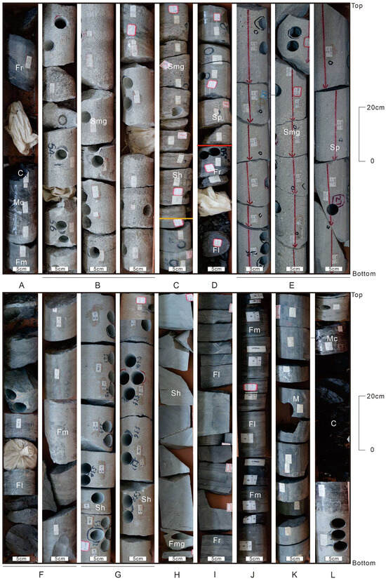 Photographs of cores showing main lithofacies associations’ characteristics of the Lower–Middle Jurassic in the study area. (A) Muddy siltstone with horizontal and ripple bedding, massive carbonaceous mudstone and coal seams (Well M1, 603.06–608.96 m); (B) Pebbly sandstone with massive bedding, fining upward, with carbon fragments (Well M1, 603.06–608.96 m); (C,D) Superimposition of two sets of fining-upward deposits is observed above the red line: pebbly sandstone, medium-coarse sandstone with massive bedding and planar cross-bedding, scouring surfaces (Well N5, 4534.10–4539.50 m); below the red line: mudstone and muddy siltstone with horizontal bedding and ripple bedding (Well N5, 4534.10–4539.50 m); (E) Medium-to-pebbly sandstone with massive and cross-bedding, coarsening upward (T1, 2115.70–2120.40 m); (F) Interbedding of muddy siltstone and mudstone, marked by horizontal and massive bedding, with plant fossils, (Z2, 3515.90–3523.51 m); (G) Medium-to-fine sandstone with parallel bedding, scouring surfaces (Z2, 3515.90–3523.51 m); (H) Siltstone to fine sandstone with planar cross-bedding, containing black mud clasts, fining upward (N2, 4070.24–4072.36 m); (I) Muddy siltstone and mudstone with horizontal bedding and ripple bedding (N2, 4312.83–4321.33 m); (J) Muddy siltstone and mudstone interbedded, characterized by ripple and horizontal bedding (Z2, 4104.00–4110.50 m); (K) Mudstone, primarily with massive bedding and horizontal bedding (N2, 4400.26–4408.32 m); (L) Mudstone, carbonaceous mudstone and coal seams, with horizontal and massive bedding (M1, 417.09–422.69 m). Well location in Figure 1.