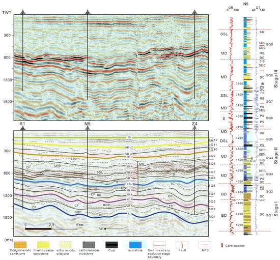 Sequence stratigraphy is a critical tool for establishing a chronostratigraphic framework, with the accurate identification and classification of sequence boundaries being essential for constructing a stratigraphic framework [,]. This study aims to develop a sequence stratigraphic framework and analyze the depositional system’s filling processes and evolution within this framework.