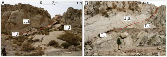 Contact relationship of unconformity TJ in the study area. (A) Kuchehe outcrop; (B) Yangxia Coal Mine outcrop; J1a: Lower Jurassic Ahe Formation; T3t: Upper Triassic Taliqike Formation. Outcrops location in Figure 1.