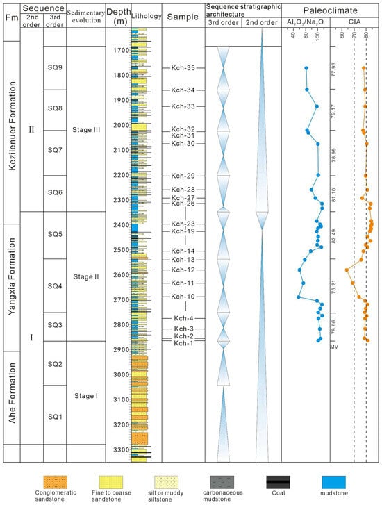 Lithofacies classification is based on sedimentary structures, grain size, lithology, and color. Lithofacies associations and seismic facies were identified by analyzing core data, well-logging characteristics, and calibrated seismic data to elucidate features of the depositional systems. Seismic facies are also useful to explain the architecture and distribution of the depositional systems in the area without wells. Sequence stratigraphic analysis is based on sequence boundaries, including unconformities and sedimentary transition surfaces, derived from seismic, well-logging, and outcrop observations to delineate sequences. However, accurate identification of key sequence boundaries and their associated stratigraphic hierarchy, particularly for fourth-order and higher-resolution sequence units, remains challenging in conventional sequence stratigraphy [,]. Recent advancements in wavelet analysis of well logs have provided a quantitative approach to delineate sequence boundaries across multiple scales, effectively addressing the limitations of traditional methodologies [,]. Hierarchical correspondence between wavelet coefficient periodicities at varying scales and sequence orders provides a robust framework for stratigraphic subdivision, where low-frequency components correlate with prolonged geological cycles defining sequence stratigraphic frameworks [,], while high-frequency components align with Milankovitch band cycles, facilitating high-resolution cyclostratigraphic analysis [,]. Within an established framework, depositional systems’ temporal and spatial distribution is determined through integrated analysis of well-to-well cross-sections and well–seismic correlation sections. The Chemical Index of Alteration (CIA) and the logarithmic ratio of Al2O3/Na2O have been established as reliable indicators of paleoclimate conditions [,,,].