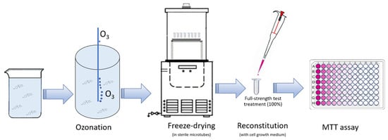 Considering the requirements of the toxicity tests applied in this study (see below), namely the need to ensure that cells are supplied with the necessary nutrients to grow and the effects noticed relate exclusively to the treatments, samples (2 mL) of ozone-treated and untreated solutions were freeze-dried (ScanVac, CoolSafe Basic & Pro, LaboGene ApS, Lillerød, Denmark) for 36 h at −100 °C in sterile microtubes, which were then stored at 4 °C in the dark until shortly before the onset of each corresponding toxicity test. As necessary to set up the test, lyophilized samples were reconstituted by adding 2 mL of cell growth medium (see below). This allowed establishing the full-strength test treatment (100%), which was then diluted with cell growth medium to obtain the remaining test treatments (12.5, 25 and 50% of sample).
