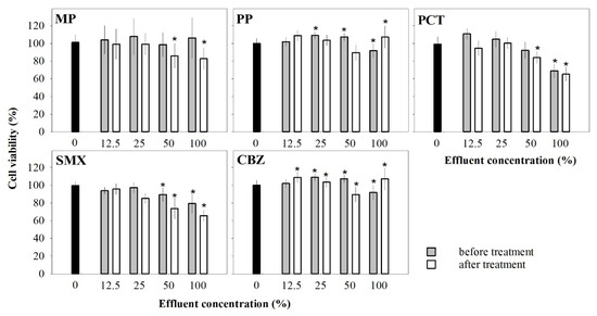 Overall, the cytotoxicity of the untreated and ozone-treated effluents is similar within each concentration. After a 72-h exposure period, the differences in the cell viability between untreated and ozone-treated samples were null or minor: for full-strength samples, the most pronounced difference was found for MP (24% improvement on cell viability). These data suggest that, despite yielding the full removal of the target compounds, ozonation was not remarkably effective on removing cytotoxicity to the HaCaT cells, even causing, in some cases, a slight increase in cytotoxicity (see, e.g., the data for the full-strength PP sample in Figure 2, where an 8% decrease in cell viability was observed).