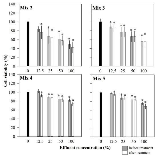 Cell viability recorded in MTT assays with the HaCaT cell line exposed for 72 h to a range of concentrations of the untreated and ozone-treated Mix 2 (MP + PP), Mix 3 (MP + PP + PCT), Mix 4 (MP + PP + PCT + SMX), and Mix 5 (MP + PP + PCT + SMX + CBZ) effluents. Bars represent the mean of three independent assays and error bars represent the corresponding standard deviation. Asterisks indicate the groups that differ significantly from the control (Dunnett’s test; p < 0.05). The detailed statistical summaries are available in Supplementary Materials (Table S2).
