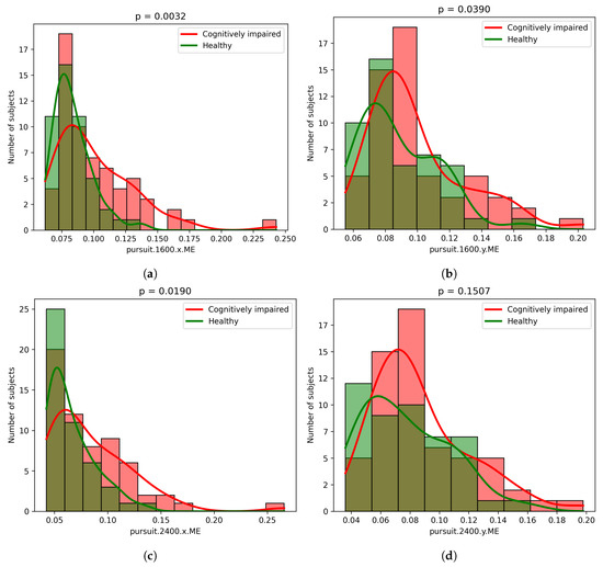We checked for the difference in distributions of all the observed features. The distributions between healthy and cognitively impaired subjects consistently differed the most for all features that assessed how well the subjects followed the location of the stimulus (mean squared error of the difference in location across all time points). These features, along with the associated p-values, are presented in Figure 3. From the plots, it can be seen that all six of the presented features (differing in speed and direction of movement) unanimously showed that the errors (higher values of the features) increased with cognitive impairment. On the other hand, from the distribution density, we can see that the two groups were not clearly separated.