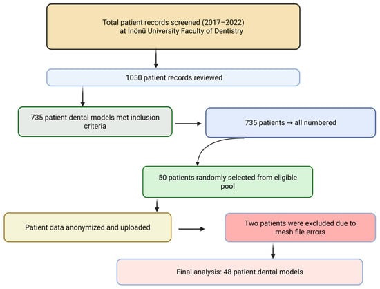 Patient records from the İnönü University Faculty of Dentistry Hospital dated 2017–2022, including male and female individuals aged 13–25 years, were reviewed. An initial pool of 735 dental models meeting the study’s predefined inclusion criteria was identified from the records of 1050 patients. From this pool, 50 patient models were randomly selected using an online random number generator (https://www.calculatorsoup.com, accessed on 8 July 2025). Prior to any analysis, all patient data were anonymized by a resident in the orthodontic department before being uploaded to the respective digital platforms. A total of 50 participants were initially included in the study. However, due to irreparable issues with the intraoral scan mesh files of two patients, the final analysis was conducted using data from 48 patients.