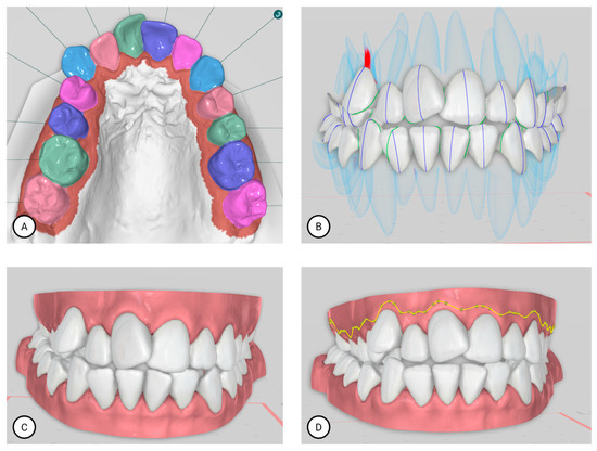 Workflow in the Titan Dental Design program. (A): AI-assisted teeth segmentation. (B): Adjustment of facial axis and roots generated by the software. (C): Upper and lower arches ready for tooth movement planning after segmentation. (D): Automatically generated cutting line (for clear aligner margins).