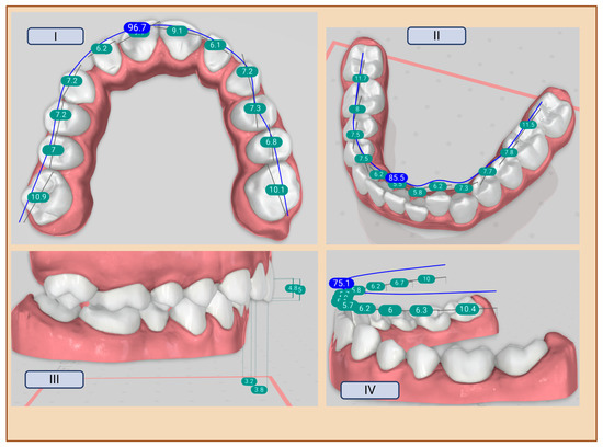 Model analysis in the Titan Dental Design program. (I): Space analysis in the maxilla—mesiodistal widths of the teeth and the available arch length. (II): Space analysis in the mandible—note how the arch form is influenced by the tooth alignment in the software. (III): Overjet and overbite measurements. (IV): Available arch length measured from the distal of the first molars (tooth #6); space analysis was limited to the region up to the distal line of the first molars.