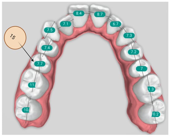 There was an almost perfect agreement between the orthodontist and the Titan AI system in the classification of malocclusion on both the right and left sides, with Cohen’s kappa values of 0.955 (right) and 0.900 (left), respectively (p < 0.001). Similarly, no statistically significant differences were observed among the three groups in the evaluation of anterior and overall Bolton analyses when the location of the tooth size discrepancy (maxillary or mandibular excess) was consistent (anterior: p = 0.226; overall: p = 0.795). This inconsistency may be attributed to errors in measuring mesiodistal dimensions, as illustrated in Figure 4, particularly in tooth 15.