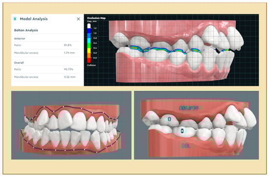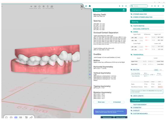 In SoftSmile (Figure 7 and Figure 8), only the Bolton analysis was evaluated, as the platform’s space calculations did not encompass the full dental arch. The 3Shape OrthoAnalyzer (Figure 9 and Figure 10) was used as the primary tool for manual measurements, with all analyses performed directly by three orthodontists. Two of the orthodontists had over ten years of clinical experience, while the third had one year of post-specialization experience. All examiners were trained in digital model analysis and had at least three years of experience using the 3Shape OrthoAnalyzer software. The 3Shape OrthoAnalyzer was selected as the reference standard for this study due to its well-established accuracy and reliability in orthodontic measurements, as supported by numerous studies in the literature [30,32,33]. For numerical data, the average values obtained from the three orthodontists were used. For categorical data, the value agreed upon by at least two of the three orthodontists was accepted as the final decision. This process was carried out by a resident.