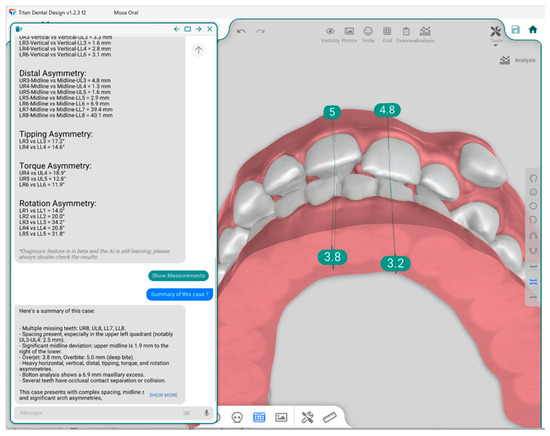 Titan Dental Designer includes a web-based AI panel (Figure 6) similar to ChatGPT, which allows users to interact with the software through case-specific questions and receive real-time responses. Although currently in beta, this feature reflects the platform’s direction toward integrated AI-driven clinical support. In contrast, the SoftSmile platform includes a similar tool known as Vision AI. However, access to this feature was not available to all users, and despite our request, access was not granted during the course of this study (https://www.youtube.com/watch?v=ZS9sye0v4aU, accessed on 8 July 2025).
