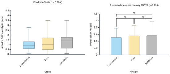 Comparison of Anterior and Overall Bolton Analysis Values Among the Three Groups (Orthodontist, Titan, and SoftSmile). Friedman test for anterior analysis; repeated measures ANOVA for overall analysis. p < 0.05 indicates statistical significance.