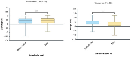 Comparison of Overjet and Overbite Measurements Between Orthodontists and Titan AI. Wilcoxon signed-rank test, *** p < 0.001.