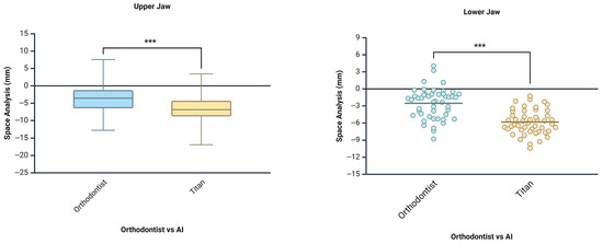 Comparison of Space Analysis Values in the Upper and Lower Jaws Between Orthodontists and the Titan AI. Upper jaw: Wilcoxon signed-rank test (*** p < 0.001). Lower jaw: Paired t-test (*** p < 0.001).