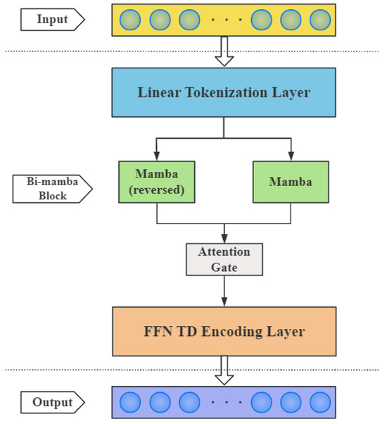 In the previous layer, we use a bidirectional Mamba layer to process the correlation (VC) between variables. If it is simply added after processing, it will lack the ability to distinguish the dynamic importance of the variables, so we add an attention gating unit after the Bidirectional Mamba output [25]. We adjust the fusion ratio of the forward and reverse Mamba outputs by calculating dynamic weights, concatenating the features of the two Mamba outputs, calculating the weights through the attention gating network, and finally performing weighted fusion of the two outputs based on the weights. The calculation formula is as follows: