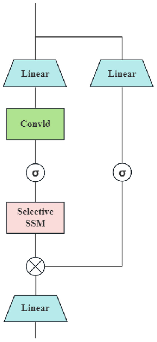 In the equation, represents the value of the input SSM after branch 1 processing. Each channel is convolved independently to capture local spatial features, and then activated by the SiLU function to introduce smooth nonlinearity and enhance feature expression capabilities. indicates that branch 2 is directly activated by linear transformation and SiLU function to generate gating signal, which is directly used for the output of SSM. The backward Mamba block reverses the input sequence and inputs it to another Mamba block.
