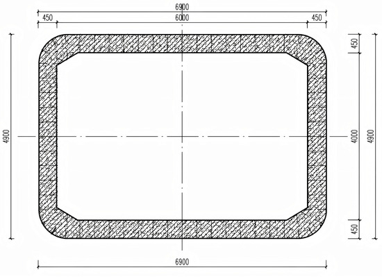 This study is based on the Ningbo Yuanyi Road underpass project that crosses existing railway lines. The underpass section employs a rectangular pipe-jacking method, with the tunnel crossing located at meleage K20 + 461. The rectangular jacking structure comprises dual cavities orthogonal to the railway alignment. The railway tracks (numbered 1 to 7) are traversed in the jacking direction from Track 7 to Track 1, with Figure 5 showing the construction layout plan. Prior to underpass construction, the existing railway subgrade was reinforced using MJS (Metro Jet System) grouting. During the underpass operation, D-type temporary beams were installed for pre-reinforcement of the active railway lines. The rectangular tunnel has a clear span of 6.0 m and a clear height of 4.0 m, with uniform thicknesses of 0.45 m for the top slab, bottom slab, and sidewalls. Detailed dimensions of the jacking tunnel are provided in Figure 6 (all values are presented in millimeters).