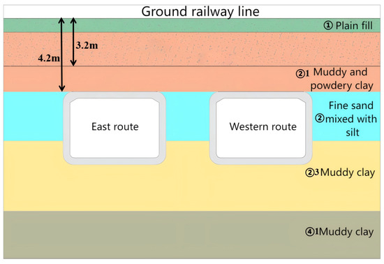 In recent years, with the continuous improvement of the density of China’s comprehensive transportation network, the intersection nodes of highways and roads have become a key bottleneck restricting the efficiency and safety of the road network. Therefore, it is essential to transform level crossings between railways and highways into three-dimensional intersections, and rectangular top-tube tunnels under existing railways are a solution to this problem. During the construction of an underpass railway project, stress redistribution will occur in the surrounding soil, causing soil settlement and deformation, which in turn will cause deformation of the upper track and affect the safety of train operation [1,2]. Therefore, it is necessary to predict the settlement of the track and roadbed caused by the construction process and take corresponding measures to control the settlement to ensure the safety of construction and railway operation [3,4].