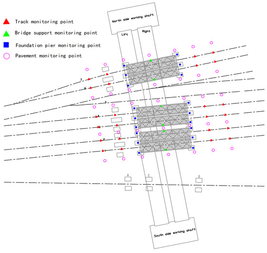 To effectively predict and analyze track and subgrade settlement deformation during construction, ensuring the safe and smooth implementation of the rectangular pipe-jacking operation, on-site monitoring has become an indispensable component of this project. Based on field conditions, the monitoring points are arranged as follows: a pier monitoring point is arranged at each end of the D24 type temporary beam, six monitoring points are arranged at equal intervals on the temporary beam, one group of monitoring points is arranged at an interval of 10 m for each track of the railway line, and five groups of roadbed monitoring points are arranged on the roadbed between the tracks. The schematic layout of monitoring points is shown in Figure 8.