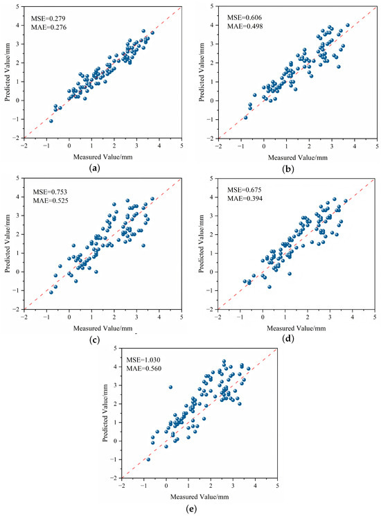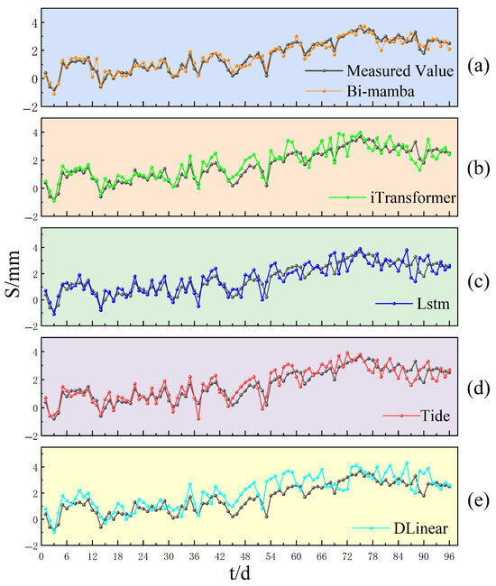 In order to verify the effectiveness of the method proposed in this paper for predicting settlement caused by underpass construction, four networks, iTransformer [22], LSTM [27], Tide [28], and DLinear [29], were selected to compare the performance of the proposed Bi-Mamba model. The input parameters and training times of iTransformer, LSTM, Tide, and DLinear are consistent with those of Bi-Mamba. The performance of the models was tested using the same test set. The comparison between the model prediction results and the actual measurement results is shown in Figure 11 and Figure 12. The MAE and MSE comparison of each model is shown in Table 2.